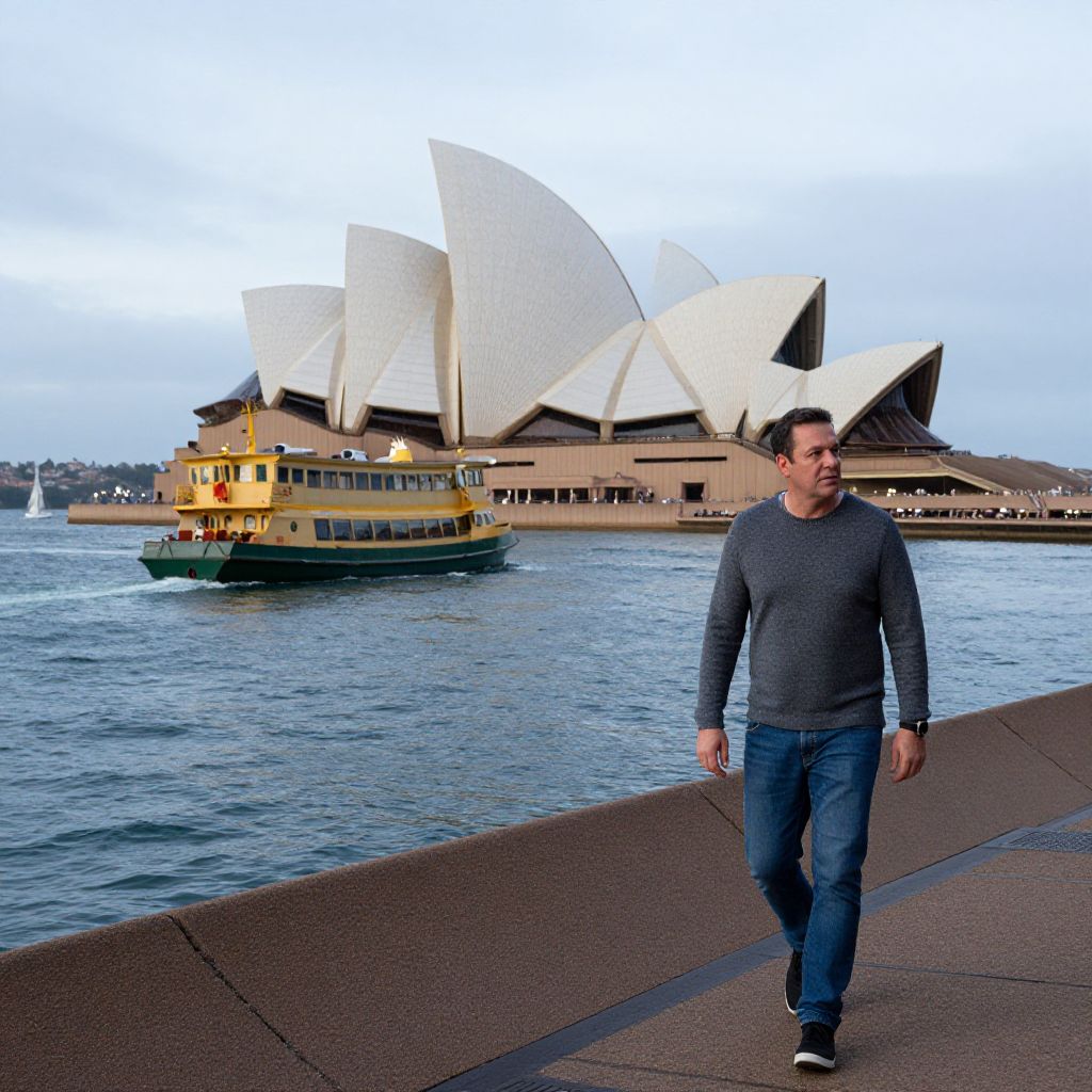 A realistic morning shot of Sydney Harbour showing the bustling waterfront, with ferry boats docking at the wharf, the Sydney Opera House standing majestic in the background, and the sails of a yacht visible in the distance. A man in a casual grey sweater and jeans walks along the harbour's edge, his face turned slightly to the camera with a thoughtful expression, the city lights still faintly visible in the far distance.