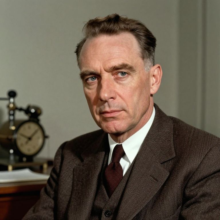 Photograph of an older Caucasian man with short, dark brown hair, light blue eyes, and a serious expression. He is wearing a dark brown, textured suit jacket over a white shirt and a dark brown tie. In the background, there is a blurry antique clock with a black and gold frame on a wooden shelf. The setting appears to be an office or a formal room with neutral, light-colored walls. The lighting is even, highlighting his facial features and attire. The image has a slightly enhanced, almost digital effect, emphasizing the man's features and the texture of his suit.