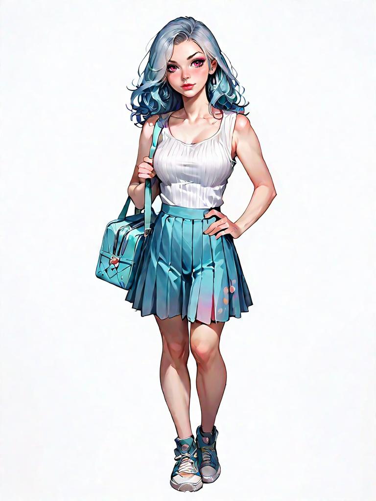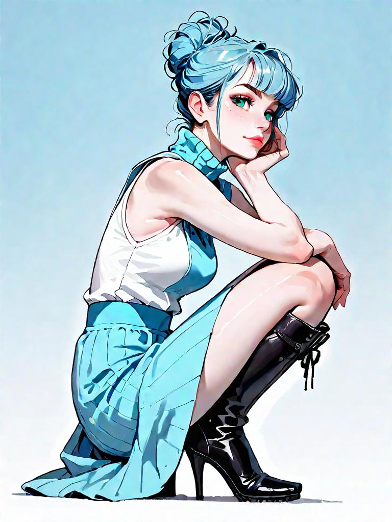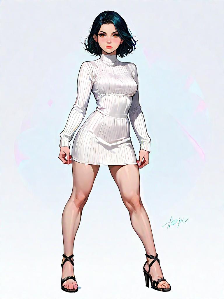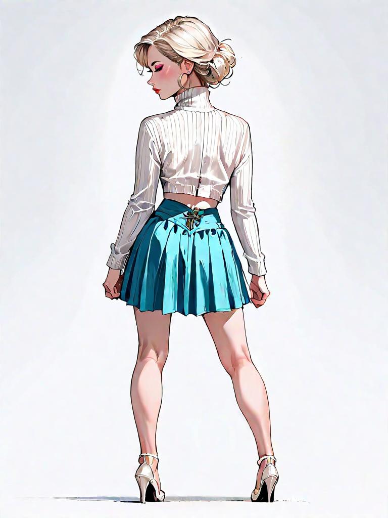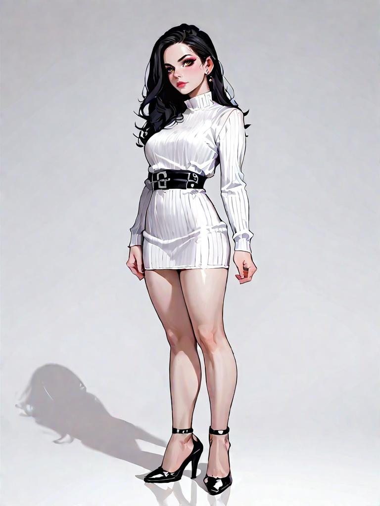 1girl, source_comics, realistic face, full body shot, Woman, contemporary chic, cropped turtleneck sweater in ivory, long sleeves, ribbed texture, paired with a high-waisted faux leather mini skirt in beige, ruched detailing, back zipper, complemented by white open-toe heeled mules, minimalistic gold hoop earrings, hair styled straight and down, plain white studio background.