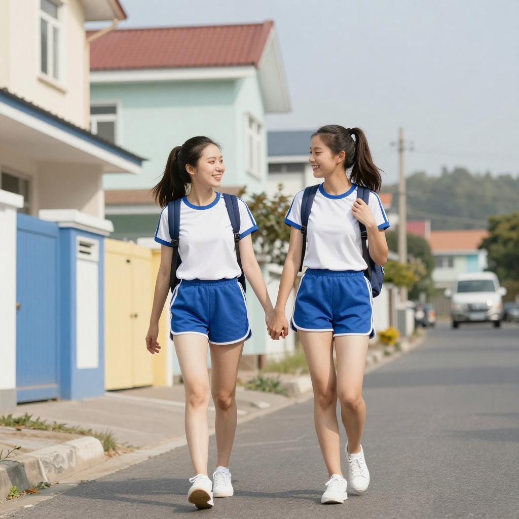 Two young Asian women with ponytails wearing matching sporty outfits consisting of white short-sleeve shirts with blue stripes and blue athletic shorts walk hand in hand in a colorful residential neighborhood. Both carry navy blue backpacks and wear white sneakers, smiling joyfully under clear daylight. The background shows houses with different pastel colors, including blue, yellow, and mint green.