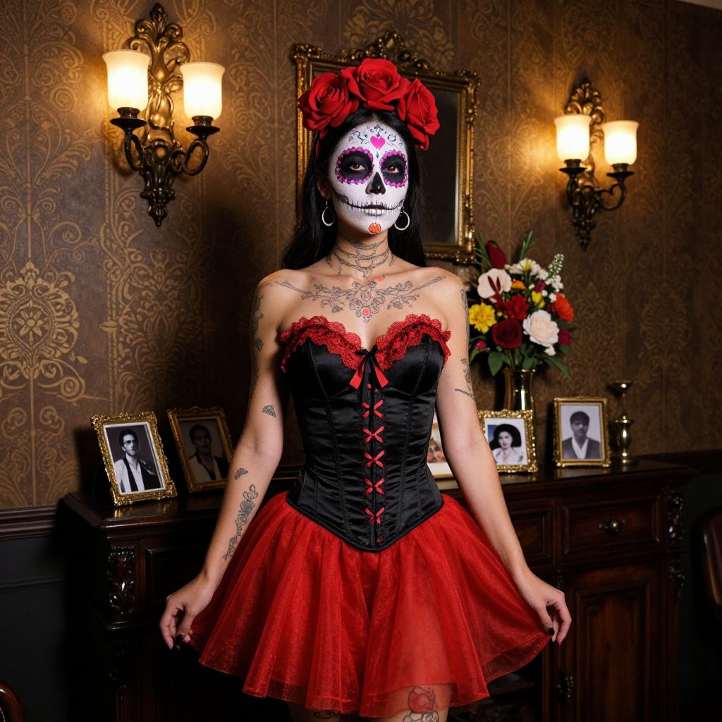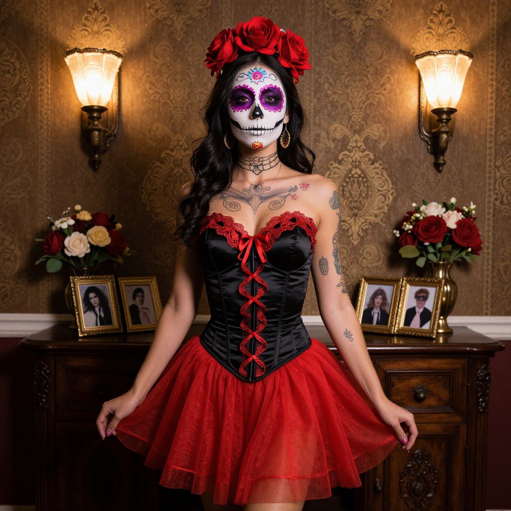 Elegant woman wearing a Day of the Dead-inspired costume featuring a black corset with red lace trim, a red tutu skirt, and a vibrant sugar skull makeup design, complemented by a red rose crown and tattoos, standing in a dimly lit room with ornate wallpaper, two wall sconces, and a dark wooden cabinet adorned with framed photos and floral arrangements.