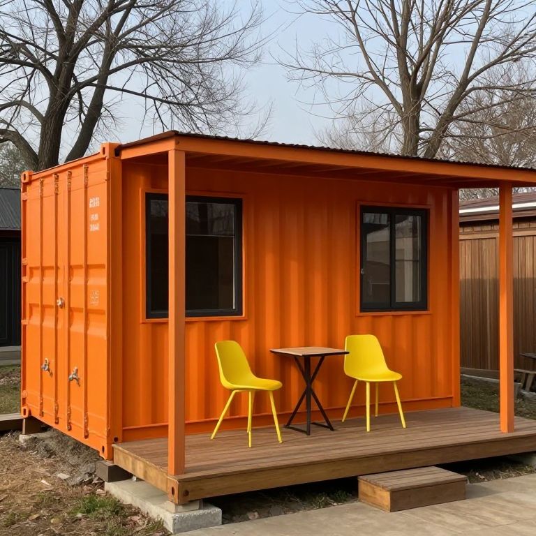 Vibrant orange shipping container transformed into a cozy tiny home, featuring a wooden deck with two yellow chairs and a small table, set against a backdrop of bare trees and open sky.