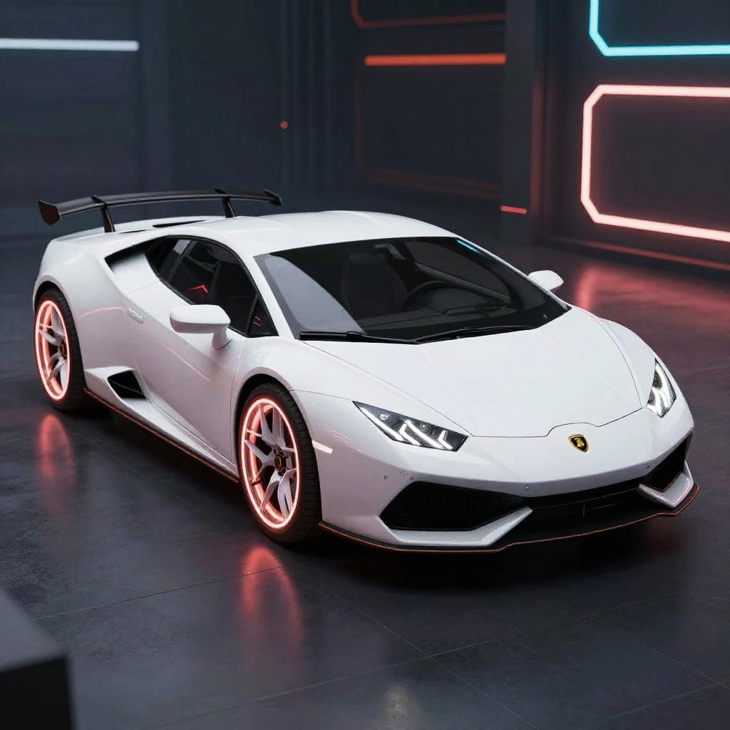Hurac├бnCar, sports car, white car, masterpiece, front isometric view, neon lights tires, cyberpunk background, smooth outer texture, bokeh, cinematic shot, big tires