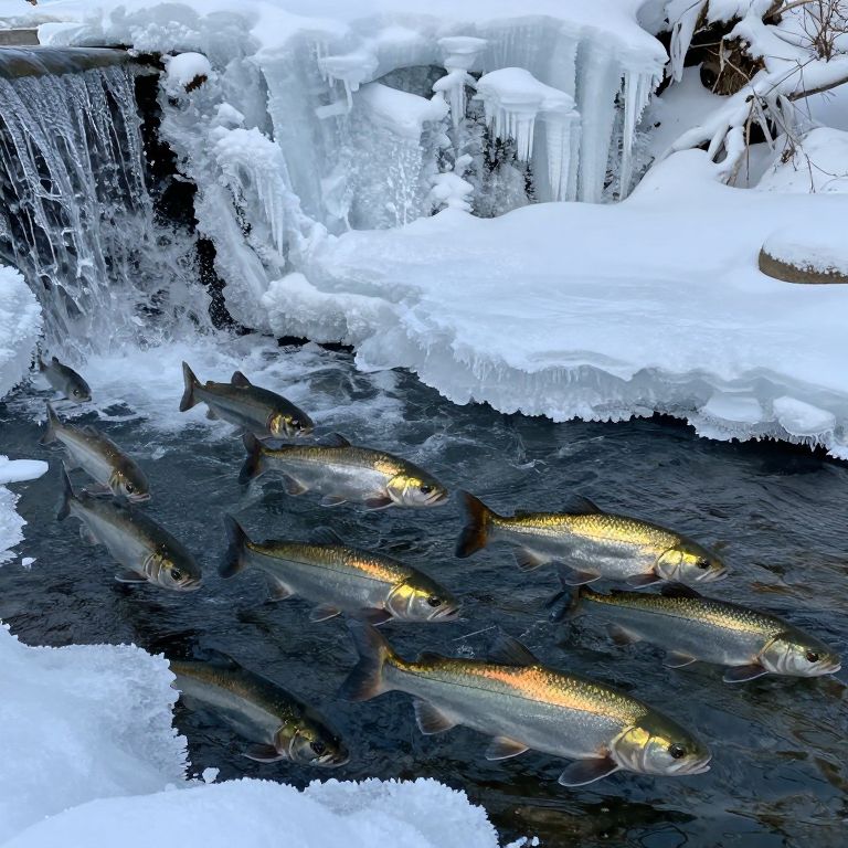 Photograph of a frozen waterfall with icicles hanging from the top, cascading into a dark, icy stream. Five rainbow trout, with iridescent yellow and green scales, swim in the lower part of the stream. The water is dark and contrasting sharply with the bright white ice and icicles. The trout are positioned diagonally from the bottom left to the mid-right, appearing lively amidst the cold environment. The image captures a striking juxtaposition of the warm, vibrant fish against the cold, stark icy background.