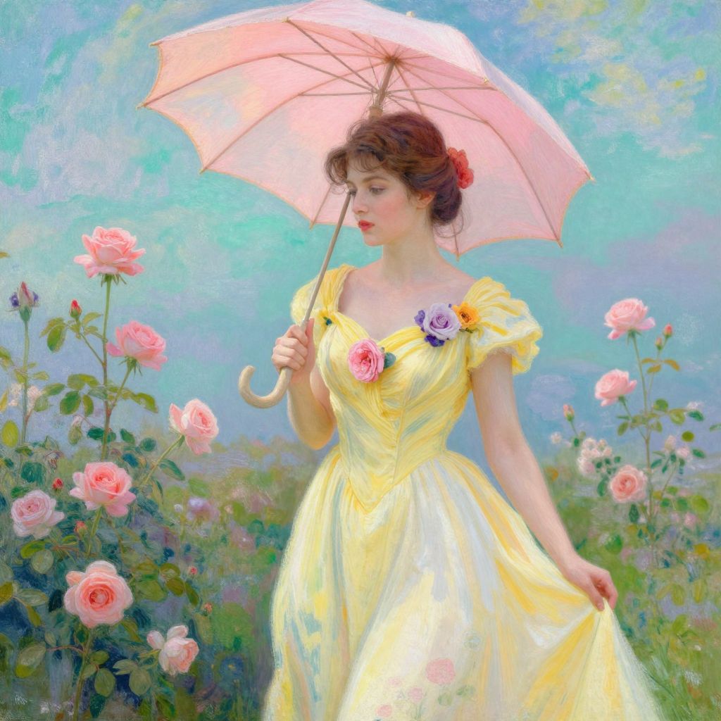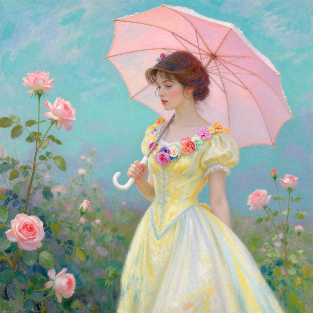 A vibrant digital illustration inspired by Monet's style, featuring a woman in a yellow dress adorned with floral accents, holding a pink parasol against a serene teal background with blooming roses, evoking a romantic and vintage aesthetic.