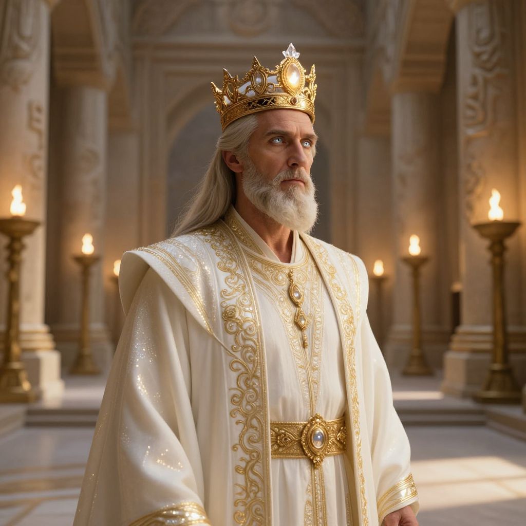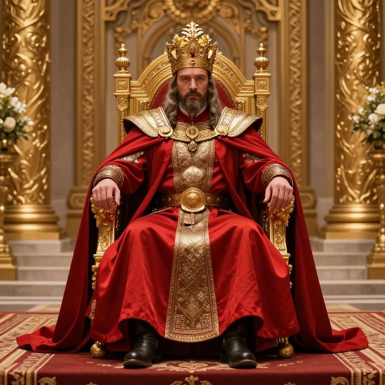 Regal king seated upon an ornate golden throne, draped in a flowing crimson cloak and adorned with intricate armor, exudes authority within a grand chamber framed by opulent gold embellishments and a patterned carpet beneath.