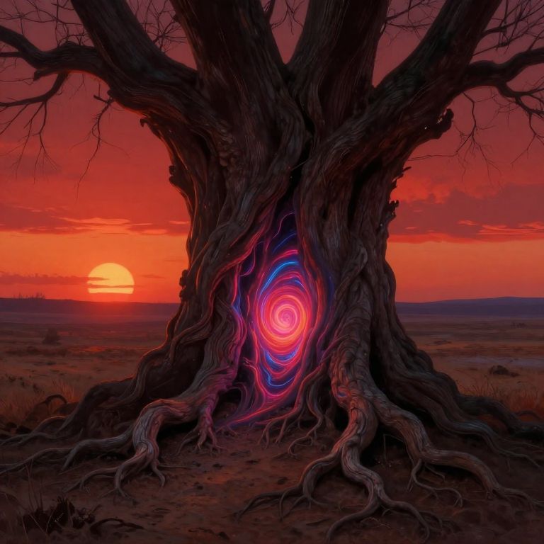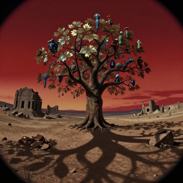 A surreal landscape depicting an arid wasteland under a crimson sky, where crumbling ruins of ancient civilizations emerge from the lifeless ground. At its heart stands a grand tree with shimmering leaves, symbolizing resilience in this bleak environment. Its branches stretch towards the heavens, offering sanctuary to a variety of peculiar creatures, their forms blending technology and biology. Captured through a fisheye lens, this scene highlights the desolation and solitude of an enigmatic world. As twilight approaches, long shadows from the solitary tree creep across the barren landscape, evoking a mix of trepidation and wonder in equal measure, reminiscent of Dalí's surrealist visions intertwined with Miyazaki's ethereal storytelling.