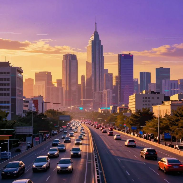 The image presents an abstract, futuristic cityscape with a vibrant, glitched effect. The scene is dominated by a bustling freeway in the foreground, filled with numerous cars moving in both directions, creating streaks of light and color. The city skyline in the distance features tall, modern buildings with sharp, angular shapes, casting long shadows. The sky above is a mix of warm hues, transitioning from a deep purple at the top to a golden glow near the horizon. The overall composition is dynamic, with the cars and buildings creating a sense of movement and energy. The glitch effect adds a digital, almost cyberpunk aesthetic, with distorted lines and shapes overlaying the scene, enhancing the futuristic feel.