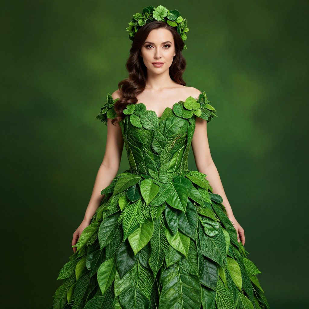 This enchanting image features a woman dressed in an elaborate green dress made entirely of leaves and foliage, blending seamlessly into a lush green background. The intricate details of her outfit and the vibrant shades of green create a stunning visual that celebrates nature and elegance.