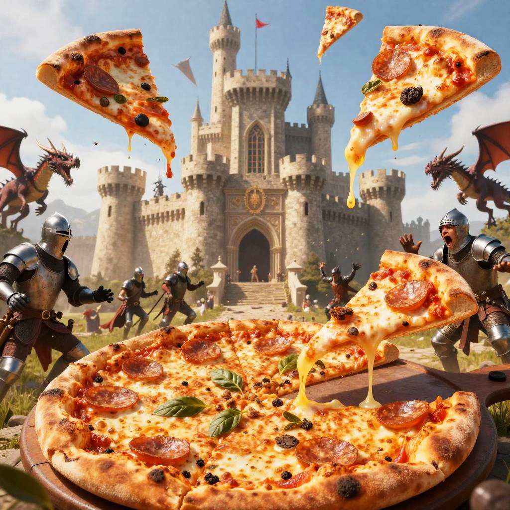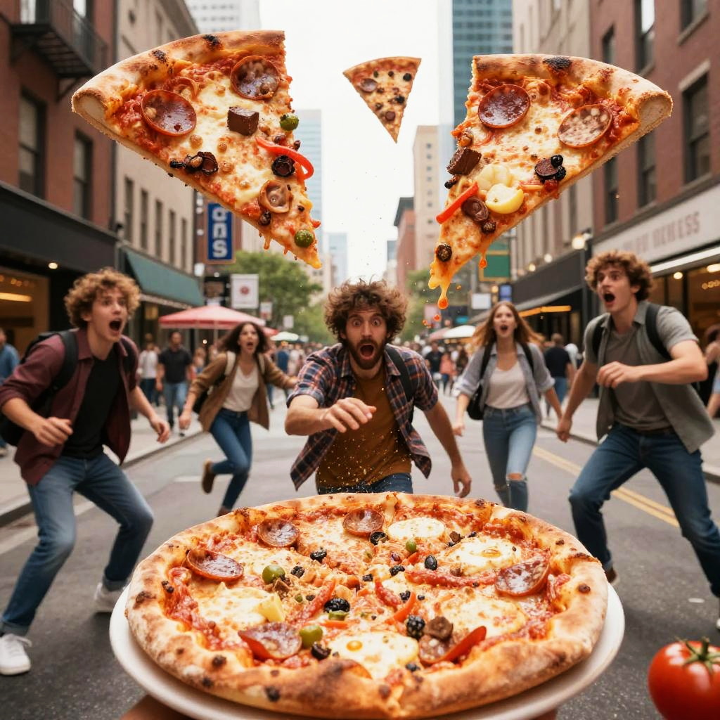 Pizza attack scene in a bustling city street, giant slices of pizza flying through the air, people dodging with expressions of surprise, vivid colors, dynamic motion, comic book style, dramatic lighting, chaos and fun intertwined