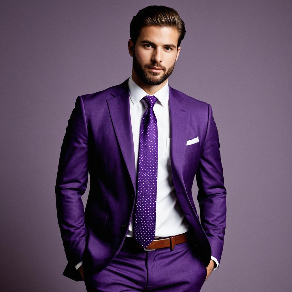 Portrait of a young man with brown hair and beard wearing a blue three-piece suit with a matching blue tie and a white blazer. He stands confidently with hands in his pockets against a plain grey background.