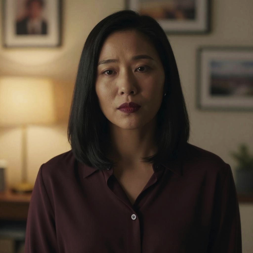 Photograph of an Asian woman with short black hair, wearing a gray and navy blue short-sleeved work shirt with red trim and a name badge. She stands in a laboratory, operating a large, cylindrical metal machine with red and blue components. Her expression is focused, and she has a medium build with visible muscle tone in her arms. The background includes blurred laboratory equipment and a framed document on the wall. The lighting is bright, emphasizing the metallic textures and her determined demeanor.