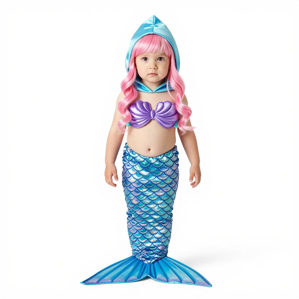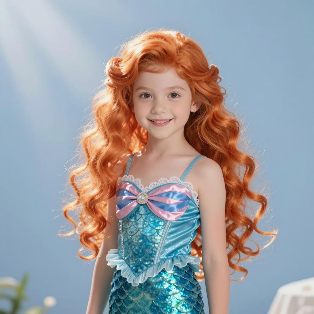 Ariel costume little mermaid, photo of a mermaid, woman with long orange hair, green and purple seashell bra, turquoise fish-scale tail, sheer tail fins, standing in modern hallway, grey walls, wooden floor, realistic, fantasy, cosplay, natural light, full body shot, front view