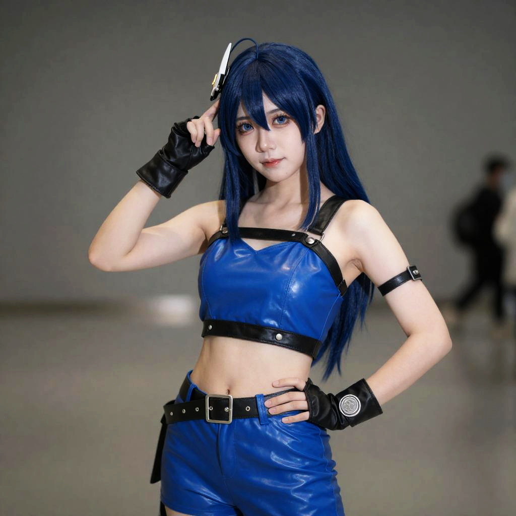 Kda Akali Cosplay, cosplaying in a blue leather outfit posing for a picture