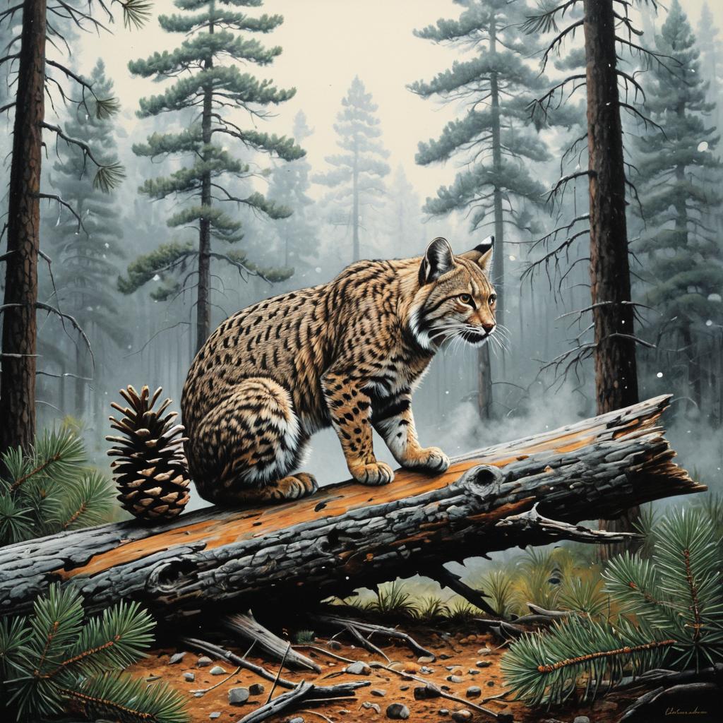 A surreal wildlife artwork where a serene forest scene is enclosed within the delicate form of an acorn cap. The composition features a slow-moving turtle among fallen leaves, set against golden sunlight filtering through tall pines. Paint splatters surround the design, adding texture and artistic flair.