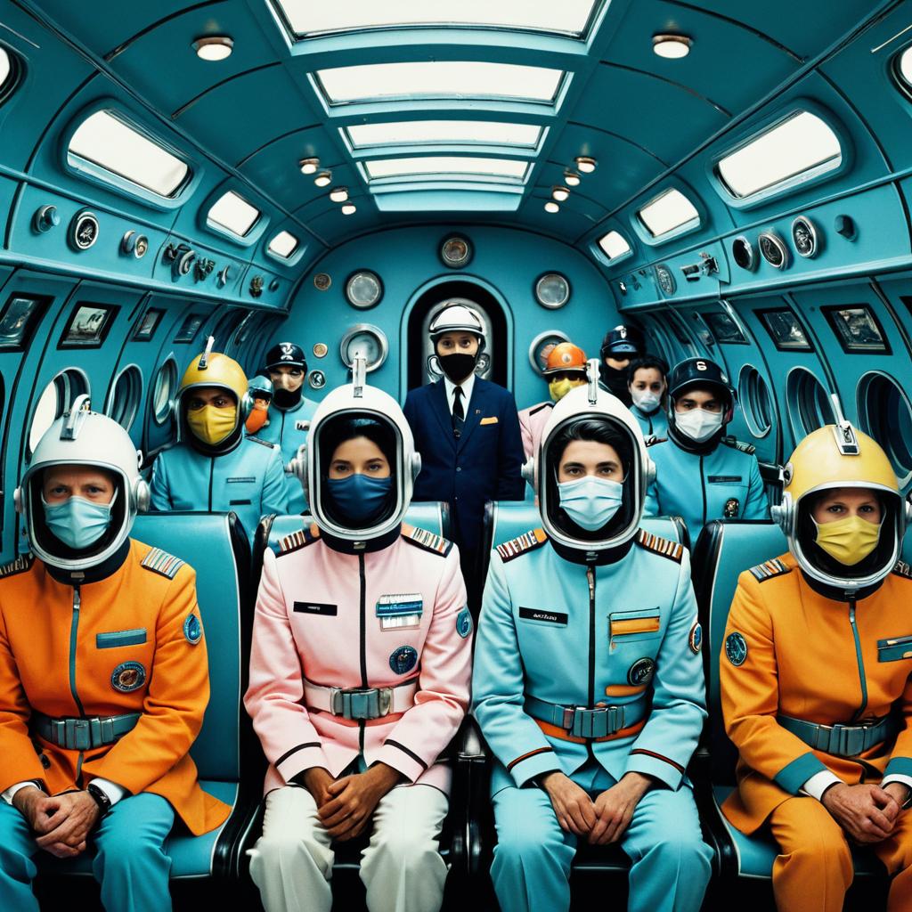 Photorealistic image of a diverse crew wearing stylish pastel-colored uniforms and intricate helmets inside a vibrant blue submarine interior. The crew members wear protective masks and are seated in a compact, futuristic vessel with multiple round windows and detailed instrument panels, capturing a sci-fi aesthetic with a Wes Anderson-inspired design.