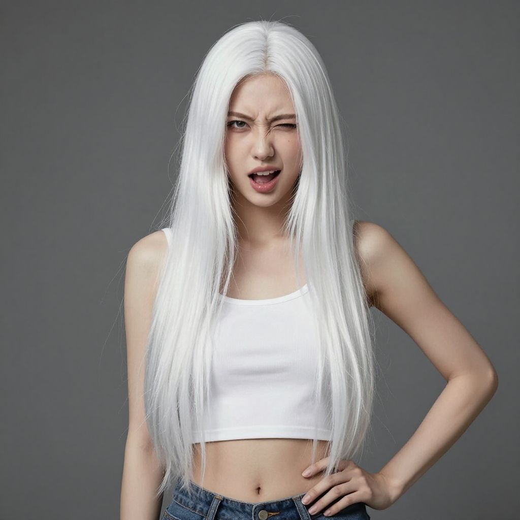 1girl, solo, smug, open mouth, long hair, straight hair, white hair, hand on hip, :3, naughty face