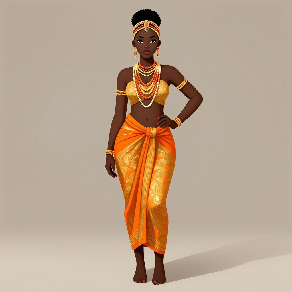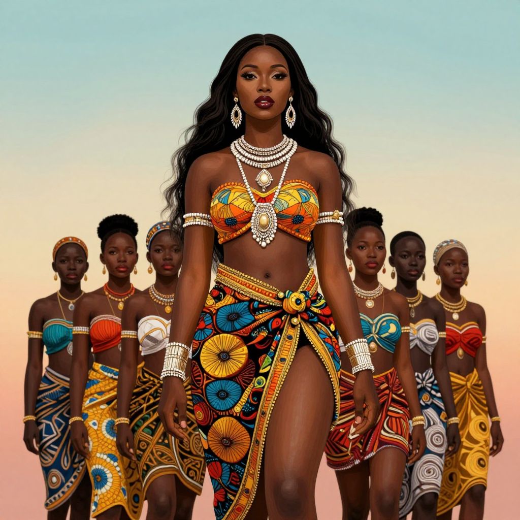 The image depicts a striking illustration of a tall, beautiful African woman adorned in a vibrant, intricately designed loincloth and an array of ornate jewelry, including a prominent necklace and earrings. She stands confidently, her long, flowing hair cascading down her back, adding to her regal presence. Surrounding her are a group of women, each wearing similar attire, creating a sense of unity and community. The background is a simple, gradient blend of soft colors, allowing the figures to stand out prominently. The overall composition is balanced, with the central figure drawing the viewer's eye, while the surrounding women form a harmonious group, all set against a backdrop that emphasizes the figures without distraction.