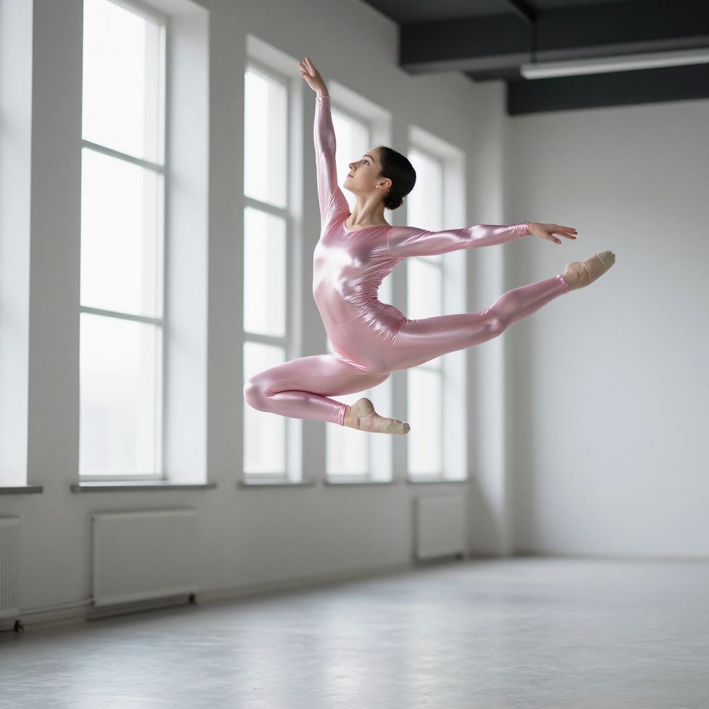 Portrait of a dancer in a glossy pink spandex suit posed gracefully mid-air in a minimalist studio with soft natural light streaming through large windows, elegance and flexibility showcased, clean and modern aesthetic