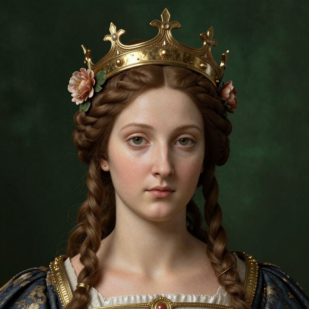 A digitally rendered allegorical portrait of a woman with Botticellian influences, featuring intricate braided hair, a regal crown, and floral embellishments against a dark green background, evoking the Renaissance style with high-definition detail and classical elegance.
