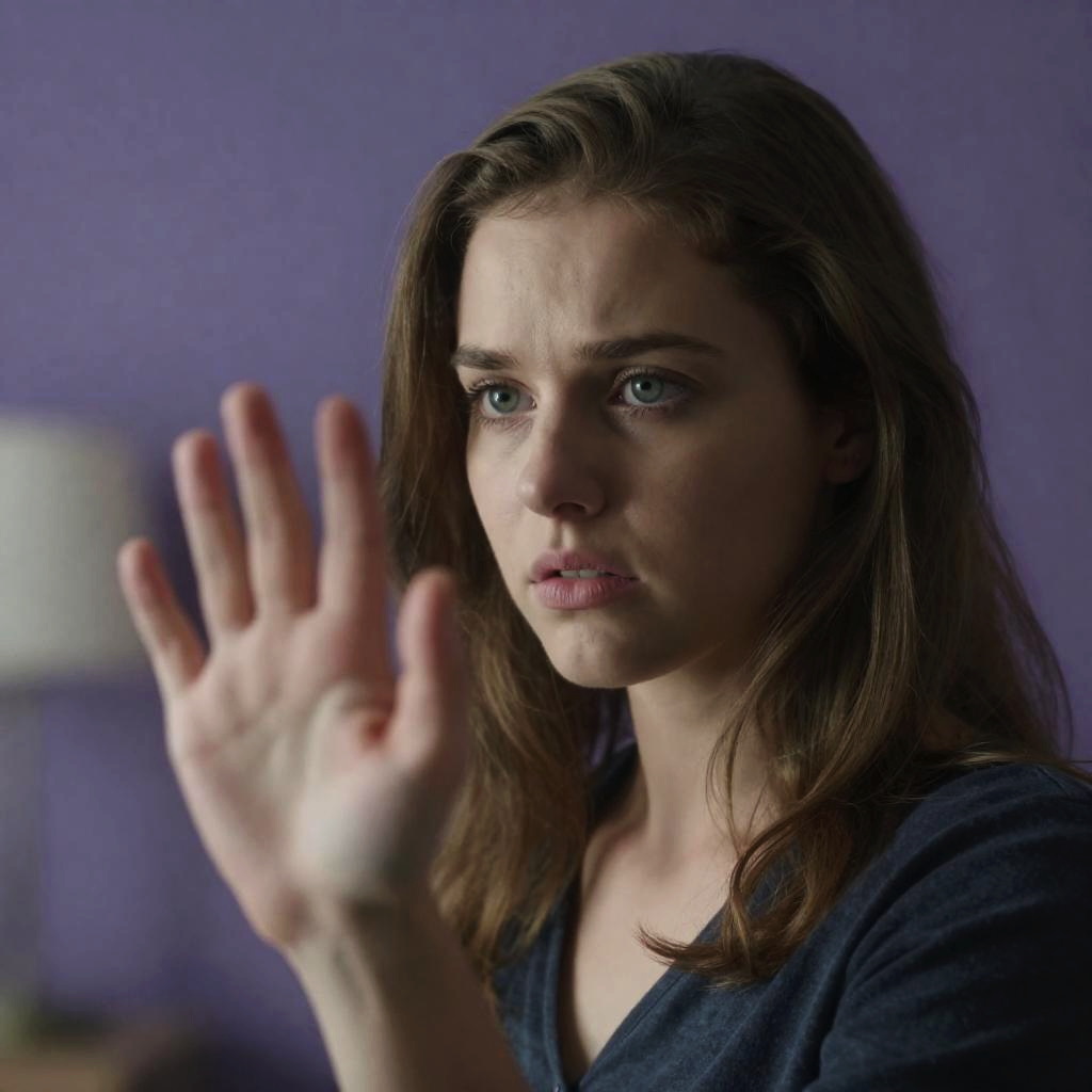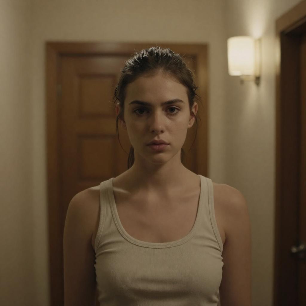 Photograph of a young woman with long brown hair, wearing a blue tank top, standing in a dense cornfield. She looks slightly concerned or focused, with a serious expression. Tall green cornstalks surround her. The background is filled with more corn, and the sky is partially visible.