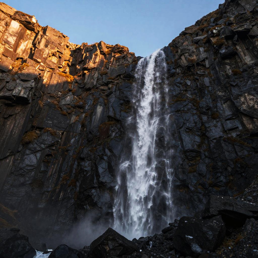 Revaling a dramatic mountain landscape during golden hour, rugged cliffs and a cascading waterfall, ultra-wide shot, photorealistic, high resolution