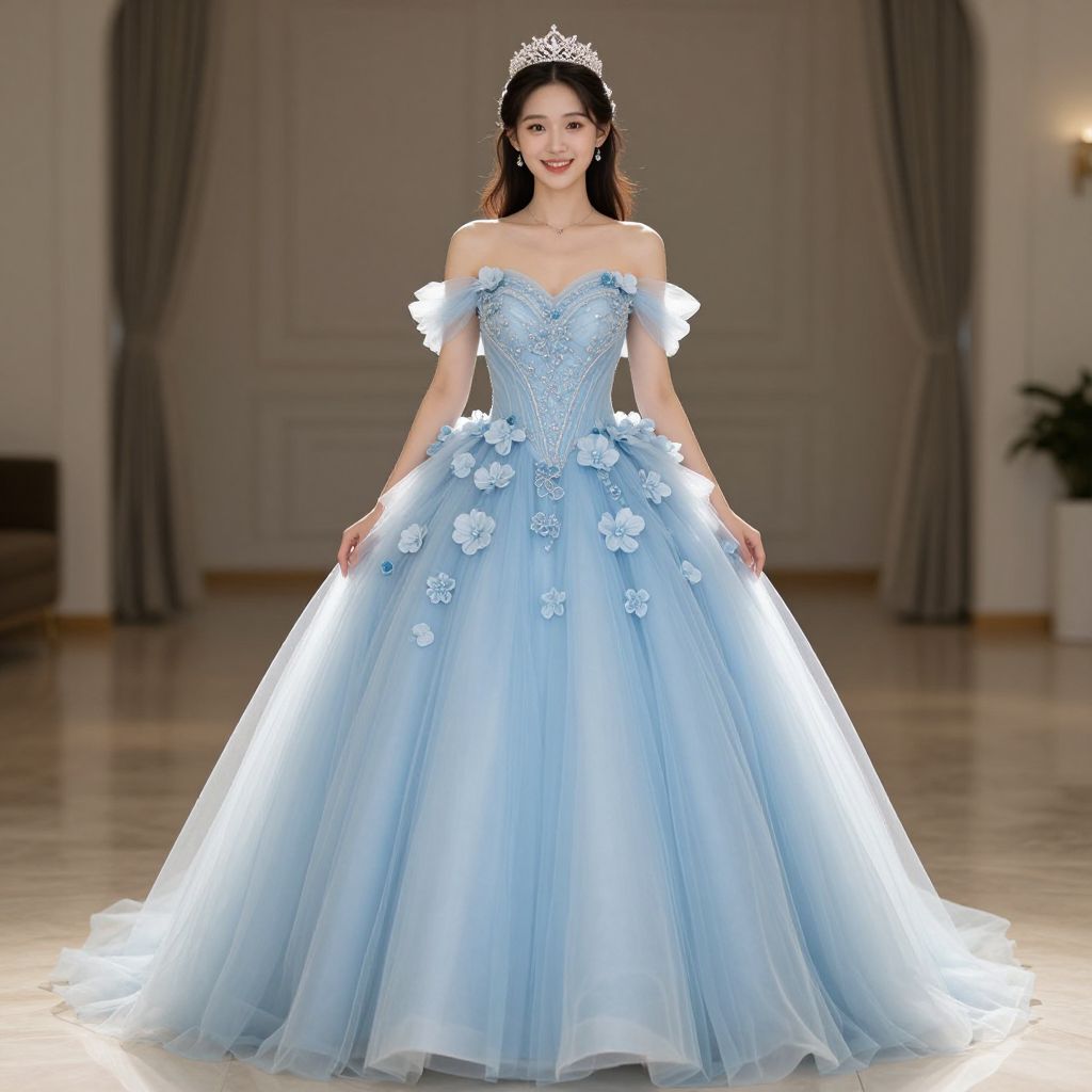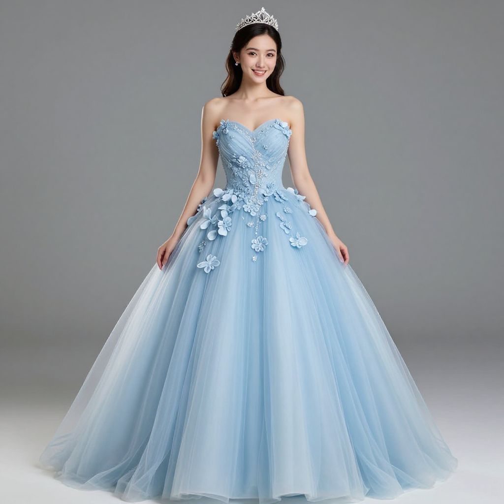 Radiant young woman wearing a stunning light blue ball gown with a sweetheart neckline, embellished with hand-made floral details and a floor-length tulle skirt, accessorized with a sparkling tiara, exuding elegance and joy.