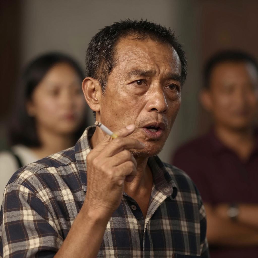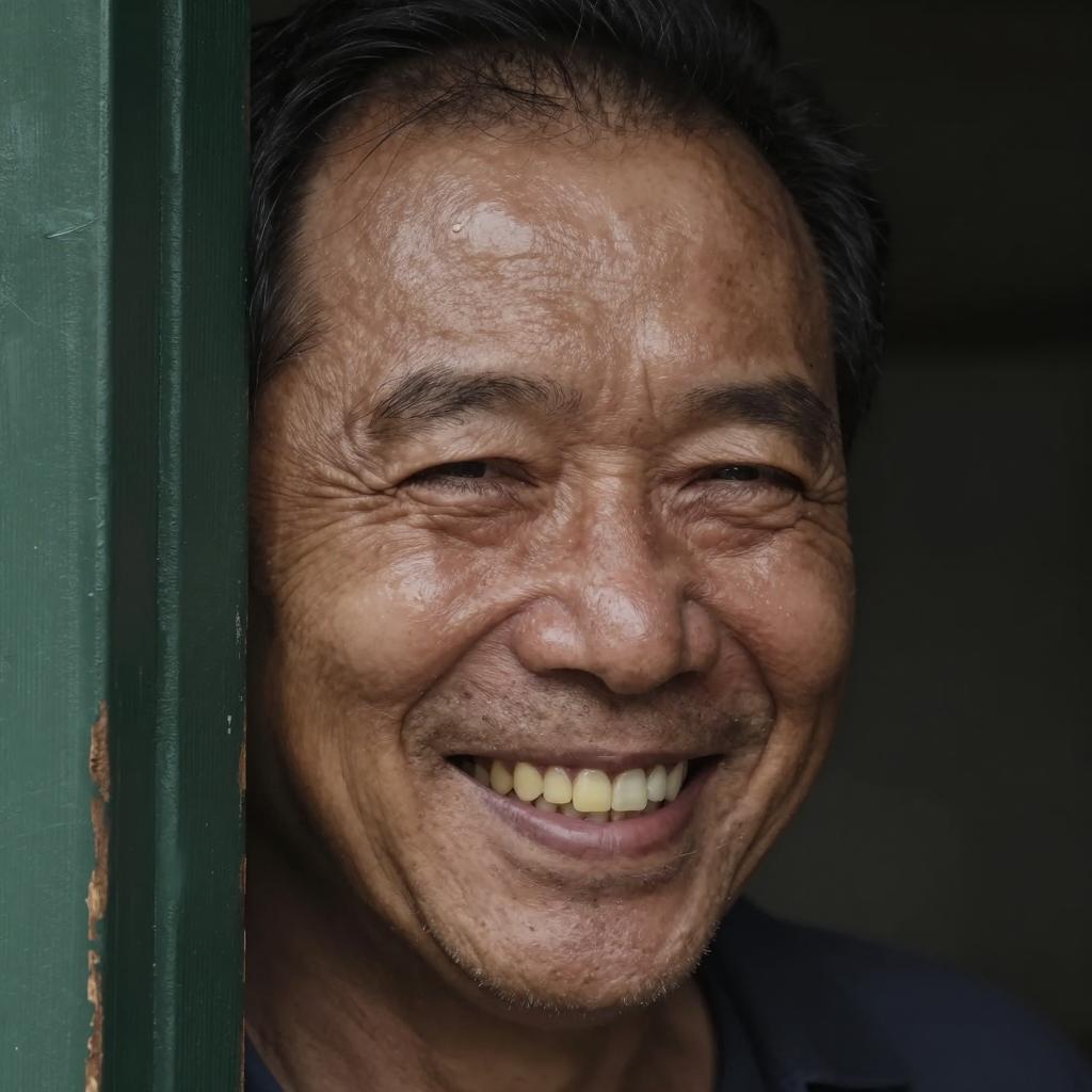 A middle-aged man with dark hair, slightly sweaty forehead, and prominent yellowed teeth. He is smiling widely, eyes squinted. Man is partially hidden behind a dark green wooden frame on the left. Light highlights his right cheek and upper lip. Background is dark, creating a contrast with his skin and smile.