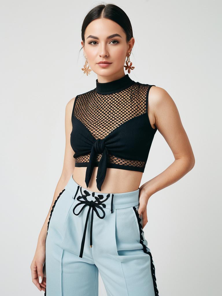 Woman, contemporary casual, black mesh crop top with embroidered detail on the chest, high neckline, sleeveless, self-tie knot at the waist, light blue high-waisted pants, believed to be snug at the waist and possibly flared at the hem, small hoop earrings, white studio background.