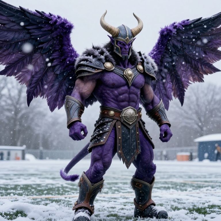 The image depicts a muscular figure, presumably Justin Jefferson, transformed into a purple Viking demon with wings. The figure stands confidently on a frozen football field, surrounded by a flurry of snowflakes that add a sense of motion and coldness to the scene. The demon's armor is detailed with intricate designs, including a helmet adorned with horns and fur trim, giving it a fierce and intimidating appearance. The wings, with their intricate feather patterns, extend from the figure's back, adding to the mythical and fantastical nature of the scene. The overall composition is dynamic, with the figure positioned centrally, drawing the viewer's attention to its powerful stance and the dramatic effect of the snowfall.