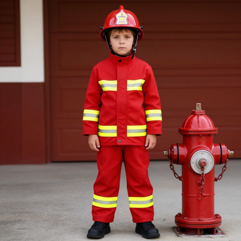 Teetot Firefighter Costume, firefighter in red uniform standing in front of a fire hydrant