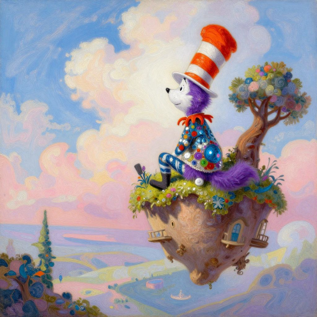 Whimsical digital painting of the Cat in the Hat with red-and-white striped hat, sitting on a floating, flower-decked treehouse,