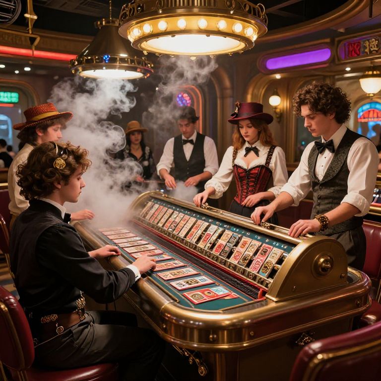 Steampunk casino bustling with inventors and gamblers, elaborate clockwork roulette wheel hand-cranked by automaton dealers, smoky atmosphere and rich wood paneling