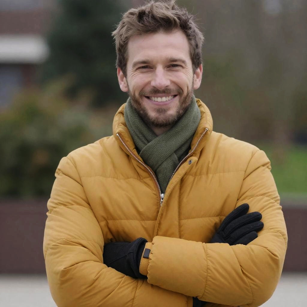 Photograph of a smiling man with light brown hair, wearing a mustard-yellow puffer jacket, green scarf, and black gloves. He stands outdoors with blurred greenery and plants in the background. His arms are crossed, and he looks directly at the camera.