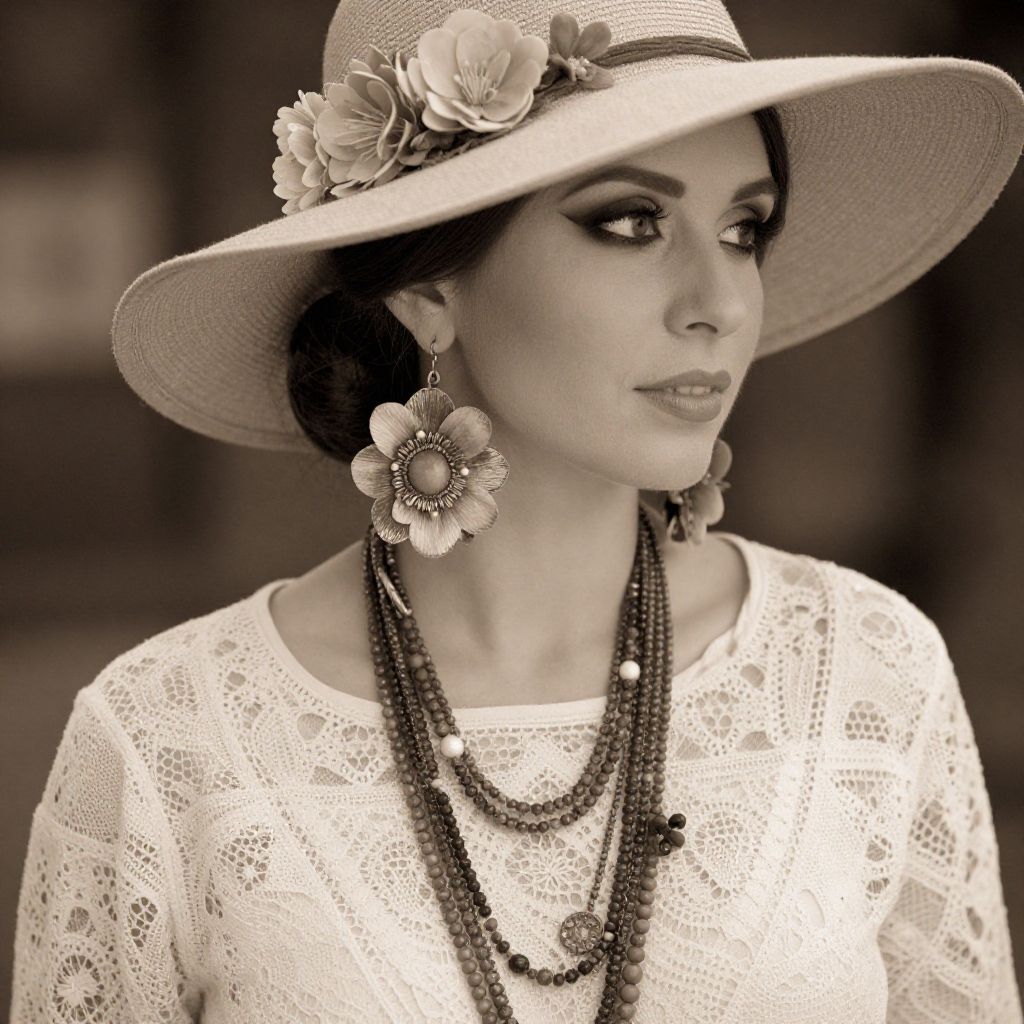Close-up portrait of a Caucasian woman wearing bohemian chic attire with delicate floral accessories. She is dressed in a lace-embellished cream blouse and adorned with multiple layered necklaces, large floral earrings, and a wide-brimmed hat decorated with flowers. The image features a vintage sepia tone and shallow depth of field, highlighting the intricate details of her outfit and accessories.