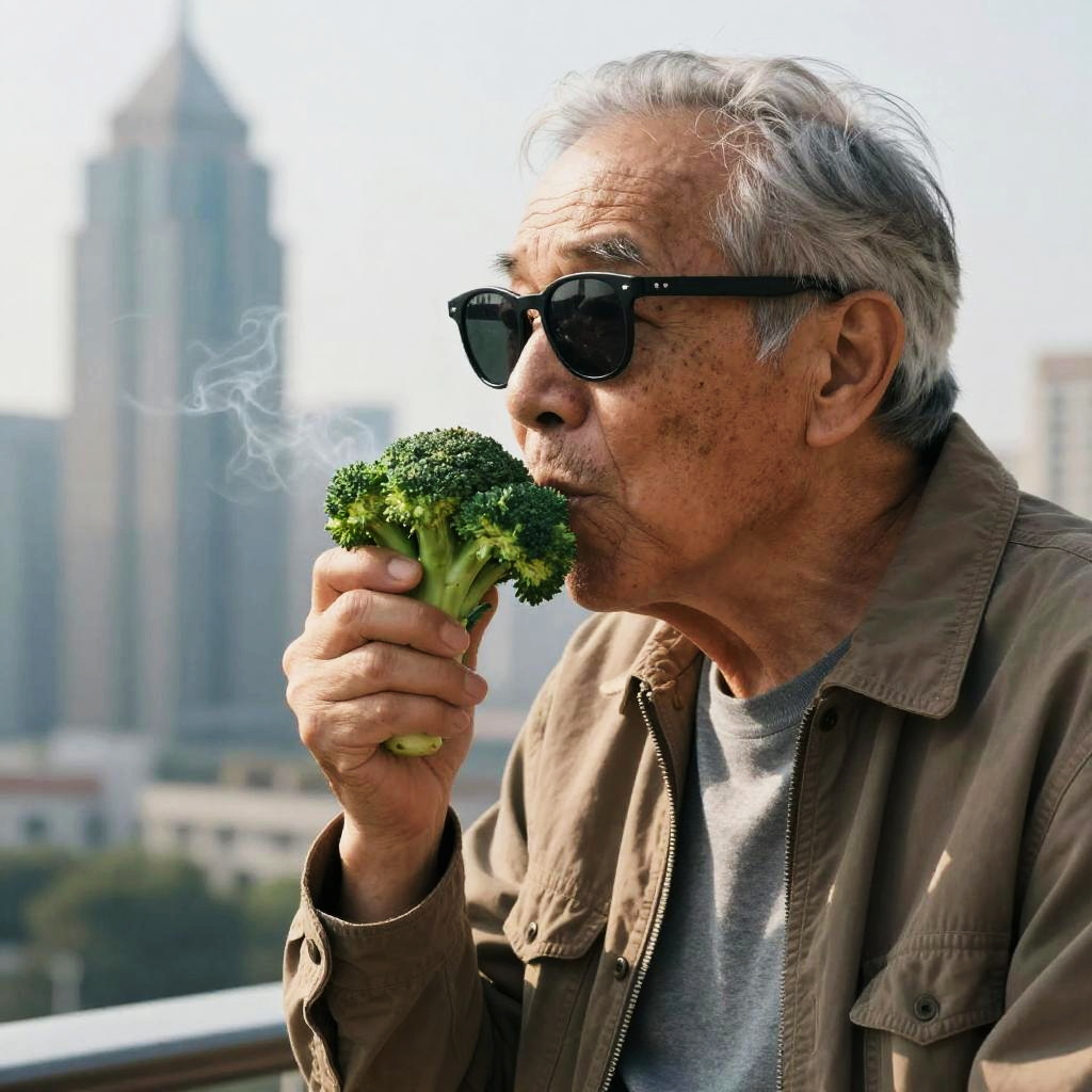Side profile of an elderly Asian man wearing black sunglasses and a brown jacket, eating a fresh broccoli floret. The scene is set outdoors with an urban backdrop featuring skyscrapers and soft natural light. Wisps of smoke appear near the broccoli, adding a cinematic effect.