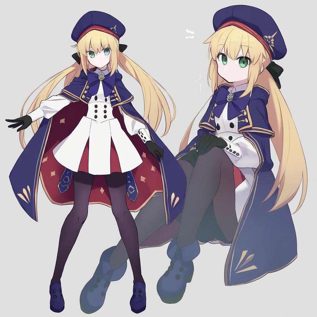 Artoria caster (second ascension) (fate), fate/grand order, 1girl, green eyes, hair between eyes, blonde hair, long hair, twintails, black gloves, blue headwear, blue cape, white dress, black pantyhose, long sleeves, beret, blue hat, by artist masara (chuujou), illustrious