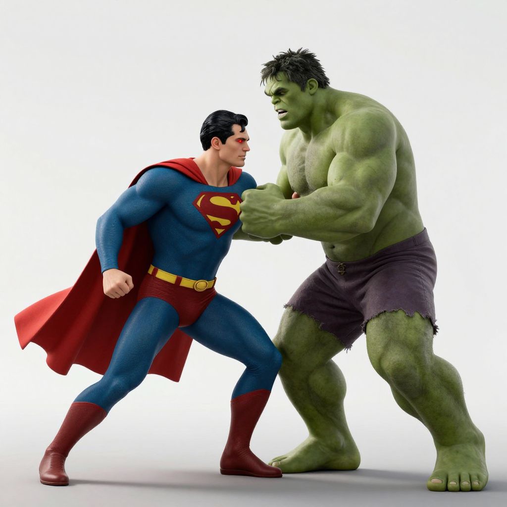 CGI image of Superman in blue suit and red cape facing muscular, green-skinned Hulk in tattered brown shorts, both ready to fight. White