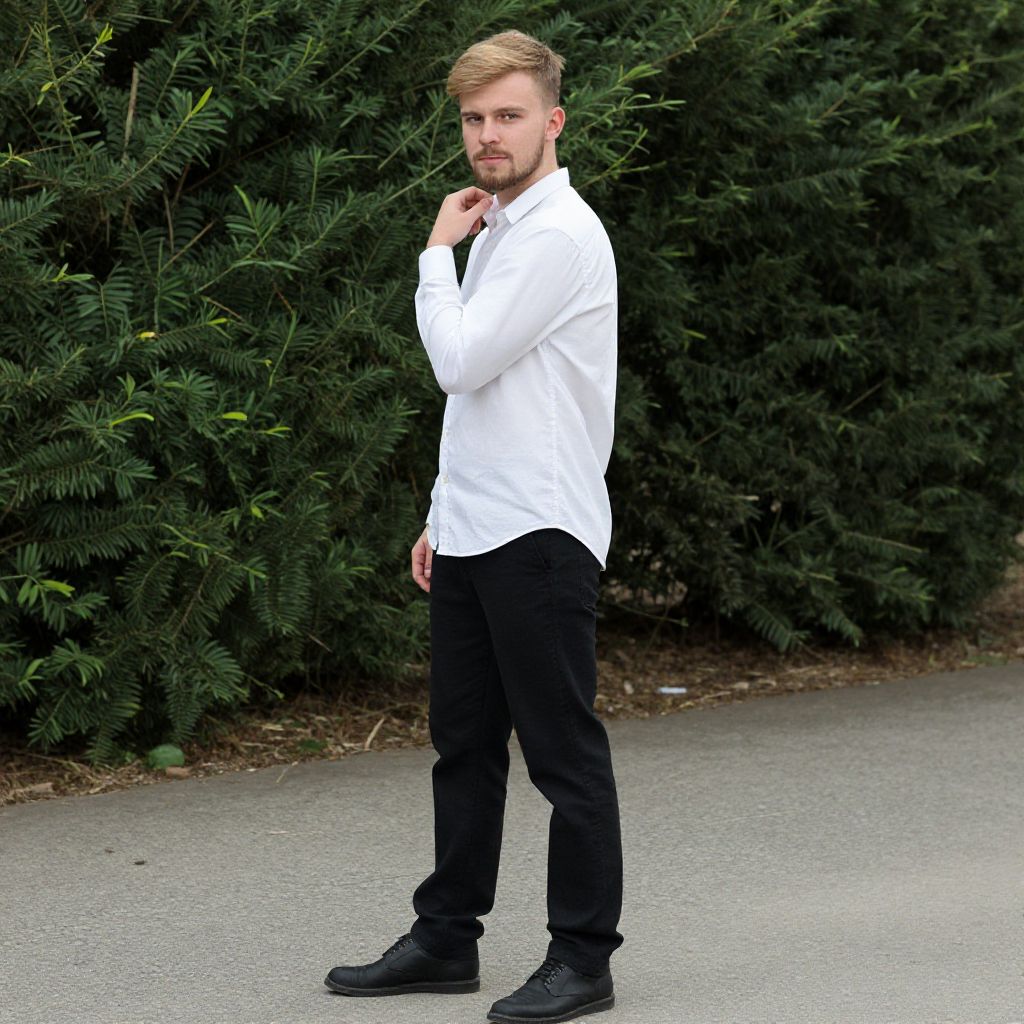 Photograph of a young Caucasian man standing on a paved surface, with dense, dark green coniferous bushes in the background. He has short blonde hair, a neatly trimmed beard, and fair skin. He is wearing a crisp white button-up shirt, black dress pants, and black leather shoes. His right hand is touching his chin in a contemplative pose, and he is looking slightly to the right with a neutral expression. The lighting is natural, indicating an outdoor setting. The image has a sharp focus and vibrant colors.
