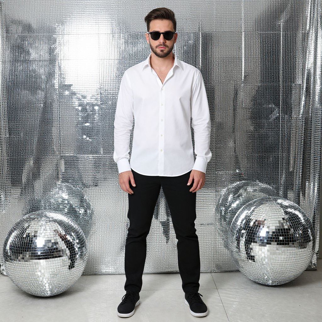 "european prince costume, 1boy, male focus, solo, blonde hair, full body, standing, arm behind back, facial hair, pants, looking at viewer, long sleeves, white shirt, shirt, black pants Realistic photo of casual sexy person with pretty face"
