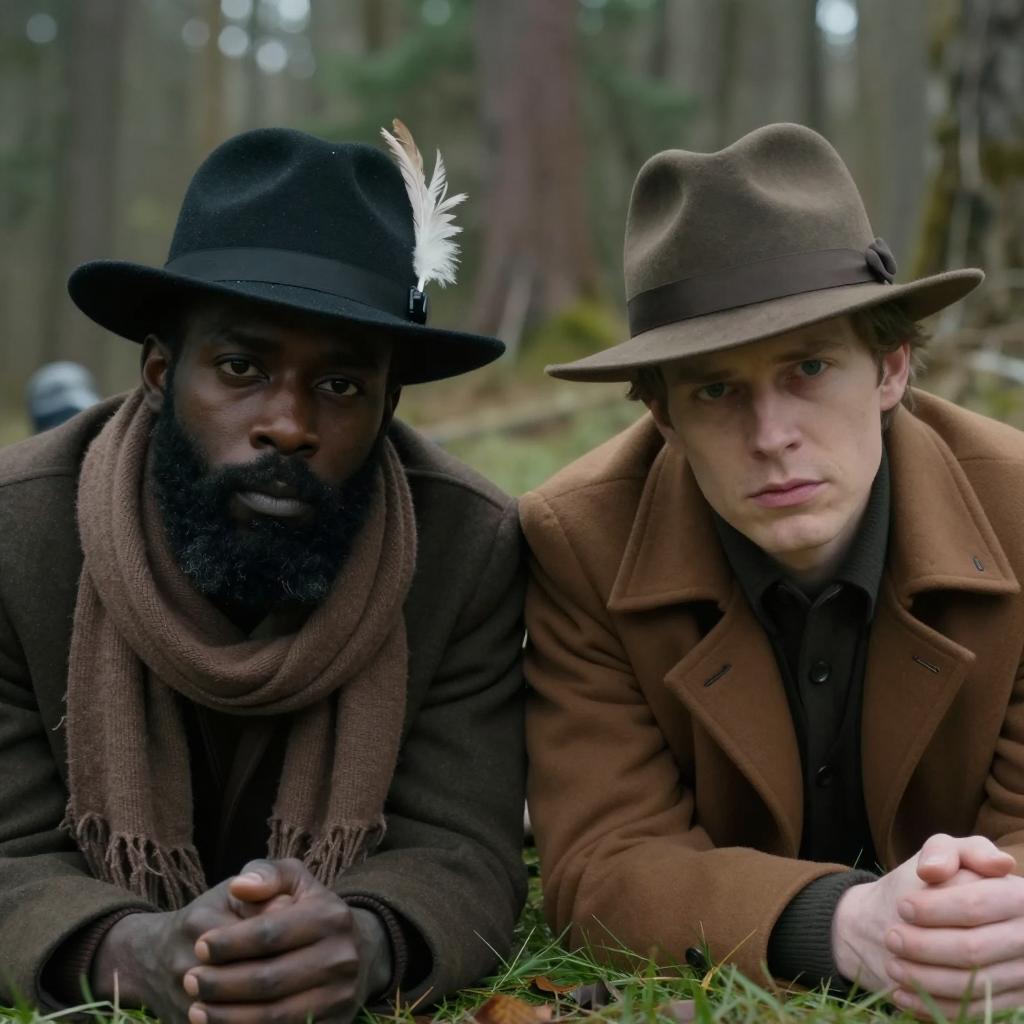 Two shirtless men behind metal bars. The man on the left has dark skin, graying beard, blood on his face, and a serious expression. The man on the right has pale skin, short hair, and a concerned look. Both lean against bars. Dim, brown-toned background.