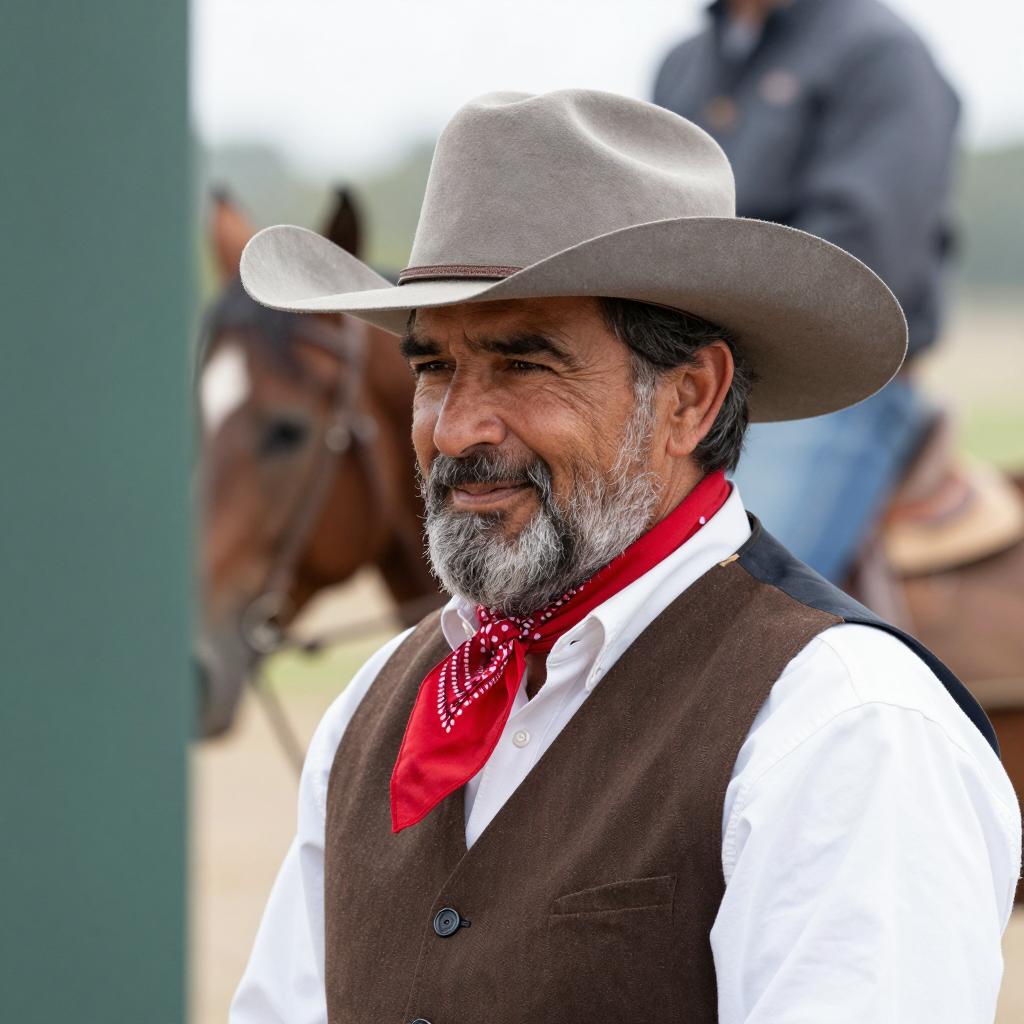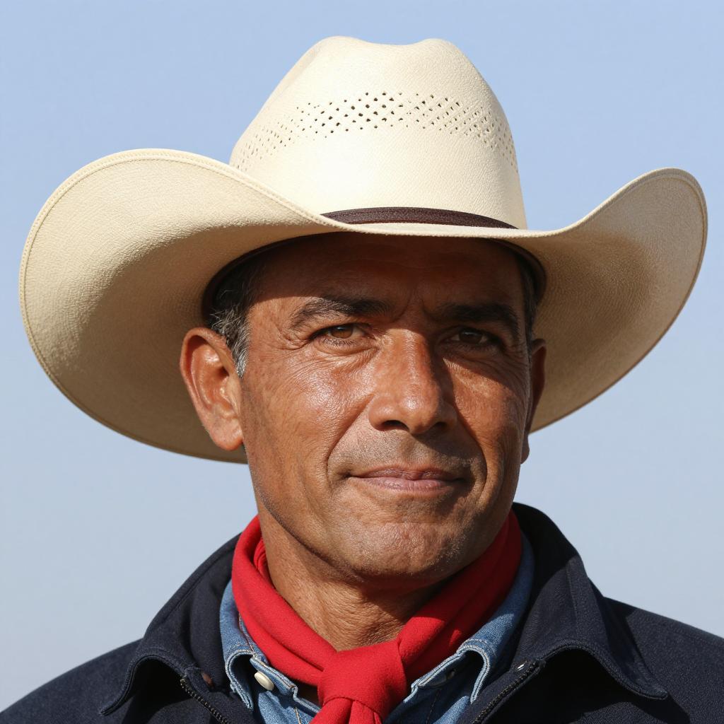 A smiling middle-aged man with tanned skin, wearing a dirty brown sleeveless shirt and a black cowboy hat with gold accents, holding a large, rough, ured fish. Background includes other men in cowboy hats, framed pictures on a red wall, and a bottle. Three men in background, smiling. Warm, brown-toned lighting.