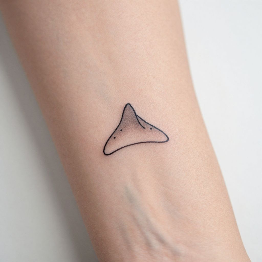 Minimalist shark fin tattoo, clean and sharp triangular fin on ankle, minimal shading, smooth contour lines, subtle marine motif, fresh ink on smooth skin, natural sunlight casting gentle shadows, elegant and understated tattoo design, contemporary minimalism.