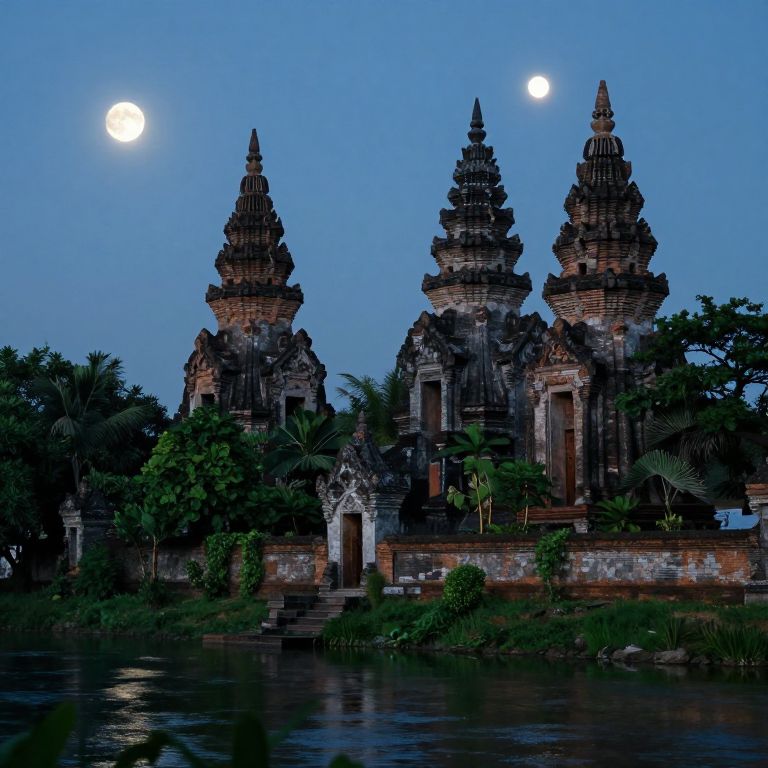 Photograph of an ancient, dark stone temple with three intricately detailed, pointed spires under a twilight blue sky. Two full moons, one on the left and one on the right, illuminate the scene. The temple's entrance, adorned with ornate carvings, is centered and flanked by lush greenery and palm trees. A reflective, calm water body is in the foreground, adding to the serene atmosphere. The temple's weathered texture contrasts with the vibrant greenery and the clear, moonlit sky.