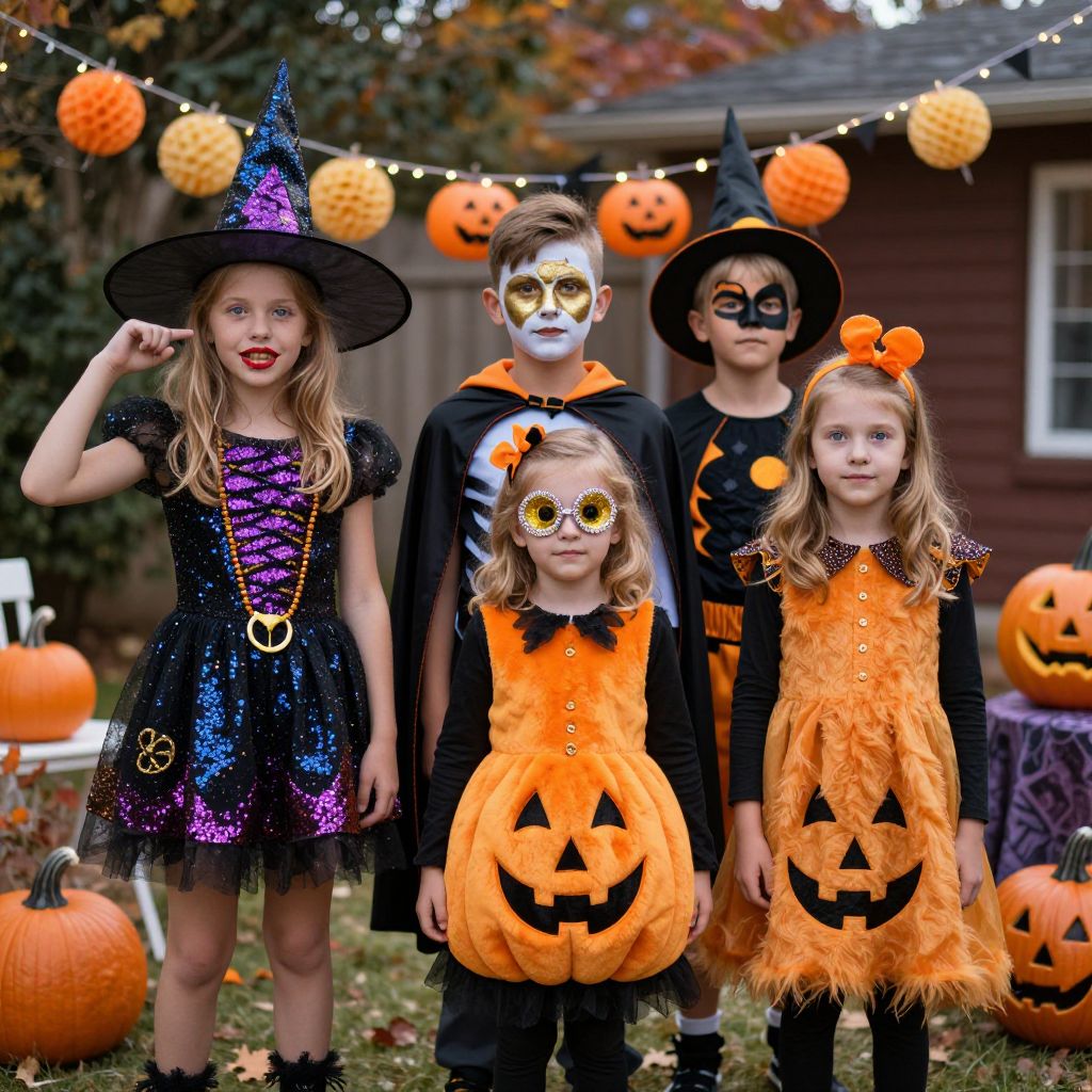 A group of children dressed in elaborate Halloween fancy costumes at a backyard party, with one girl in a glittery witch outfit with pointy hat and big red lips, another boy in a superhero cape with gold face paint, and a little girl in a fluffy pumpkin lady costume with big, sparkling eyes, all standing in a cozy autumn backyard with fairy lights and orange pumpkins in the background.