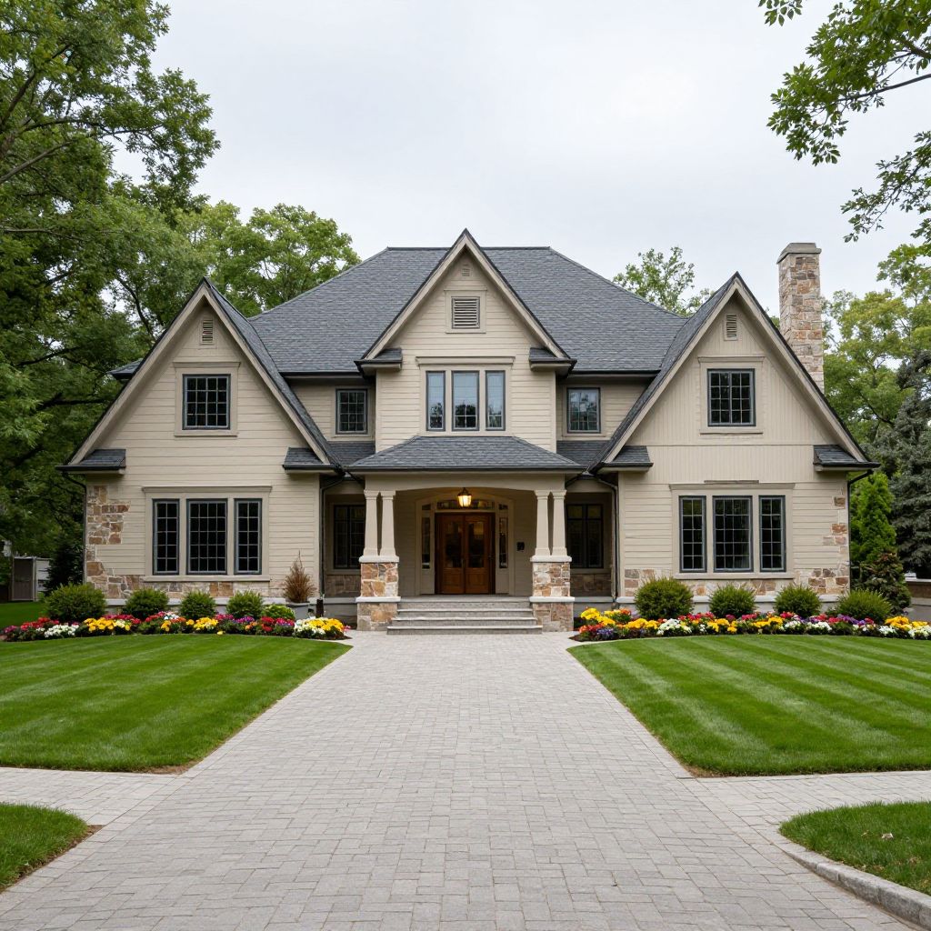 Spectacular Minnesota mansion showcases a grand two-story design with beige siding, stone accents, and a dark gray roof, surrounded by meticulously landscaped grounds featuring vibrant green lawns, colorful flower beds, and a paved driveway leading to its elegant entrance.