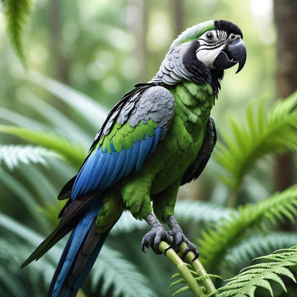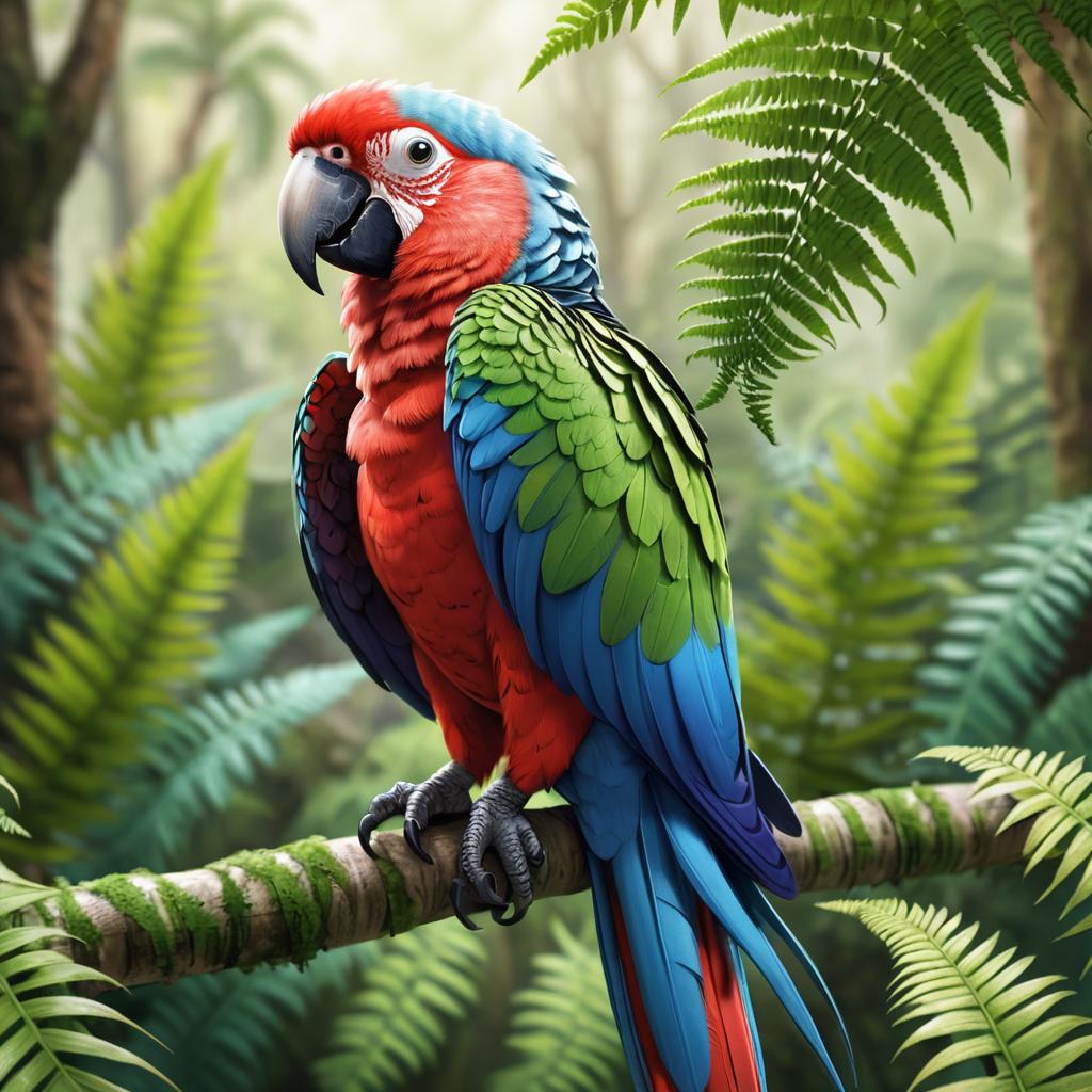 A vibrant parrot with bright red, blue, and green feathers perched on a mossy tree branch surrounded by lush green ferns in a jungle setting. The background is softly blurred to emphasize the detailed, realistic features of the bird including its curved black beak and striking black eyes.