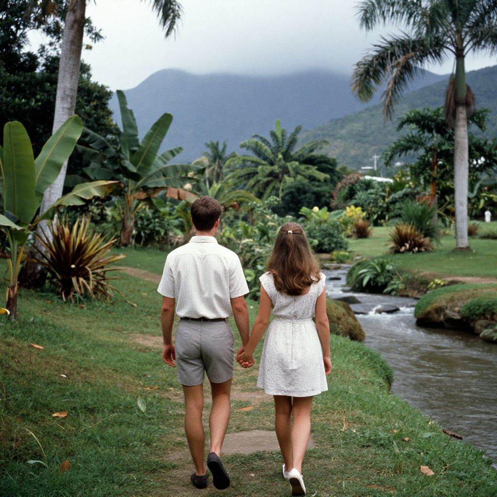 A young man and woman walk hand in hand through a lush tropical garden, strolling towards a stream with mountains in the background, captured in a 1962 film scene filmed on Ultra Panavision 70 with 70mm film.