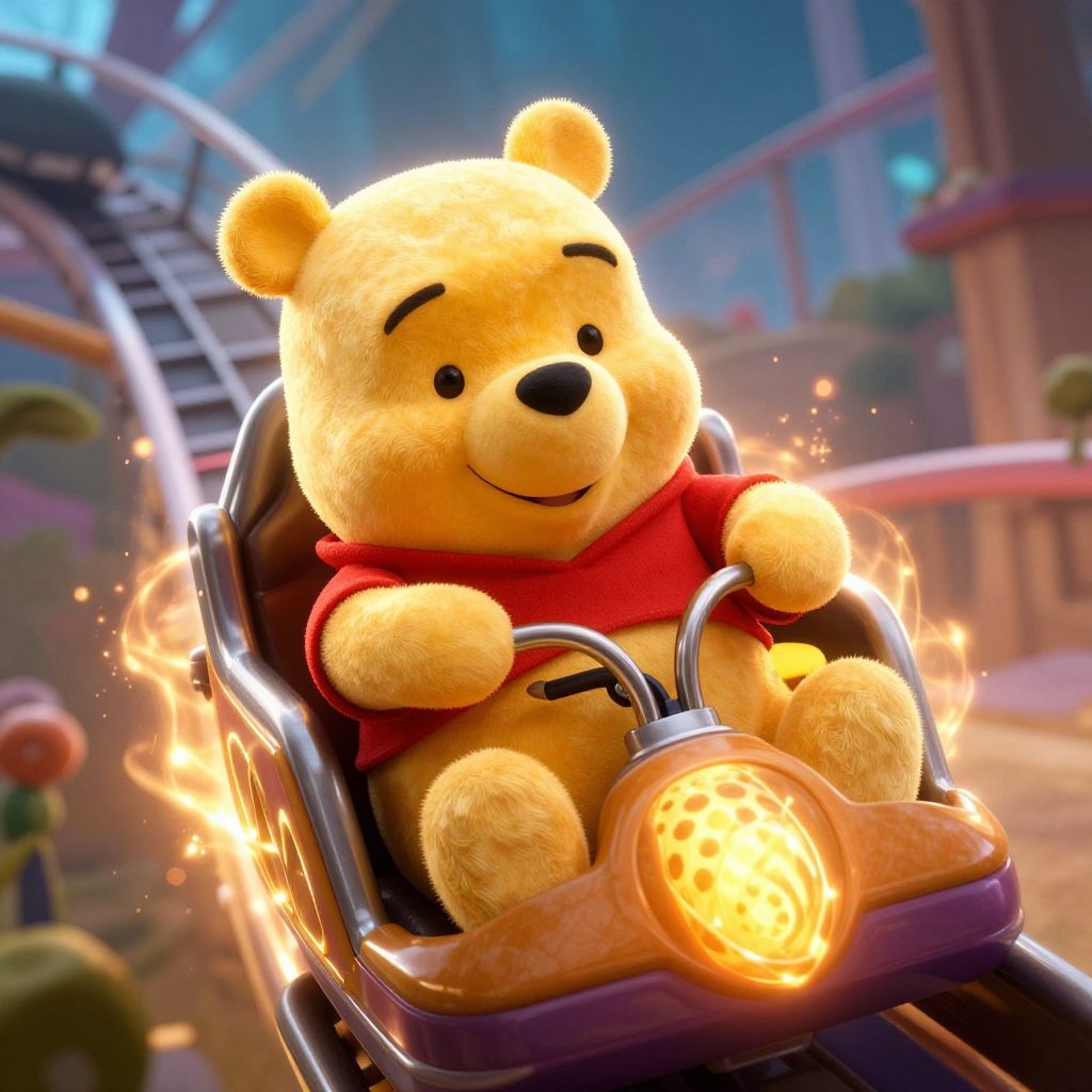 A vibrant, digital CGI image depicts a plush, yellow, smiling Winnie the Pooh bear wearing a red shirt, sitting in a shiny, black rollercoaster car. Pooh's car is engulfed in bright flames, with an illuminated, glowing orange headlamp in the front. The background shows a blurred, colorful amusement park with a curved rollercoaster track and green plants. The image combines cartoonish charm with dramatic, fiery elements, creating a surreal, eye-catching scene.