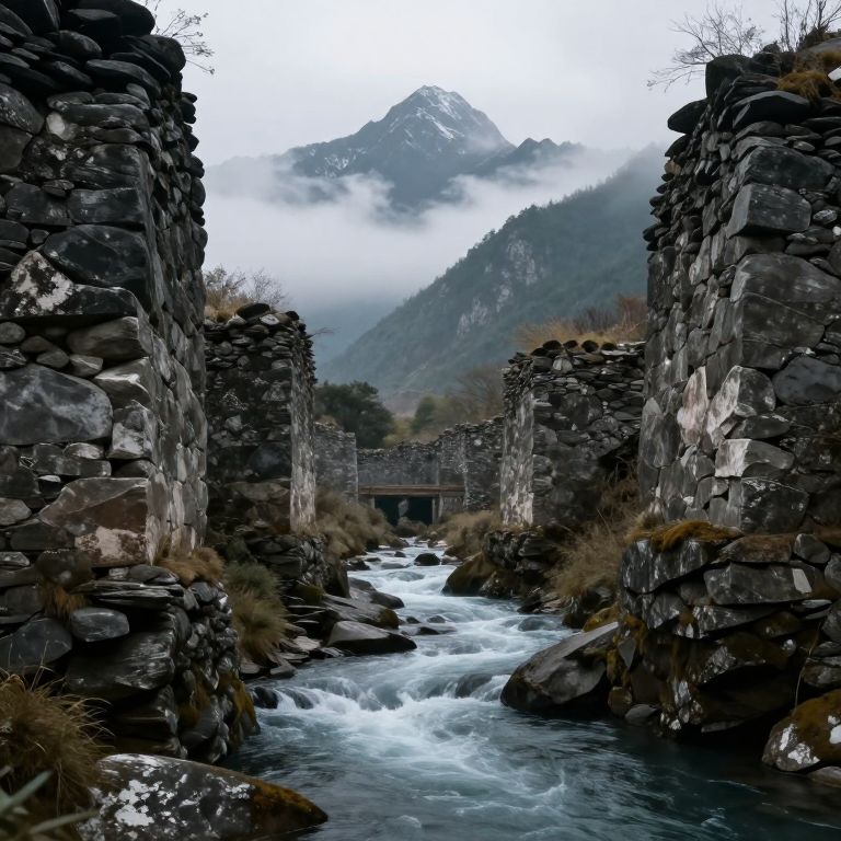 Through the rugged embrace of ancient stone, a serene river whispers secrets of eternity, guiding weary souls toward the promise of distant peaks shrouded in mist and dreams.